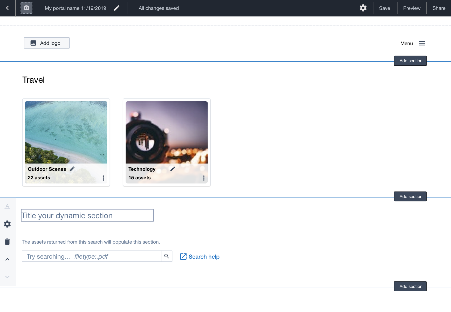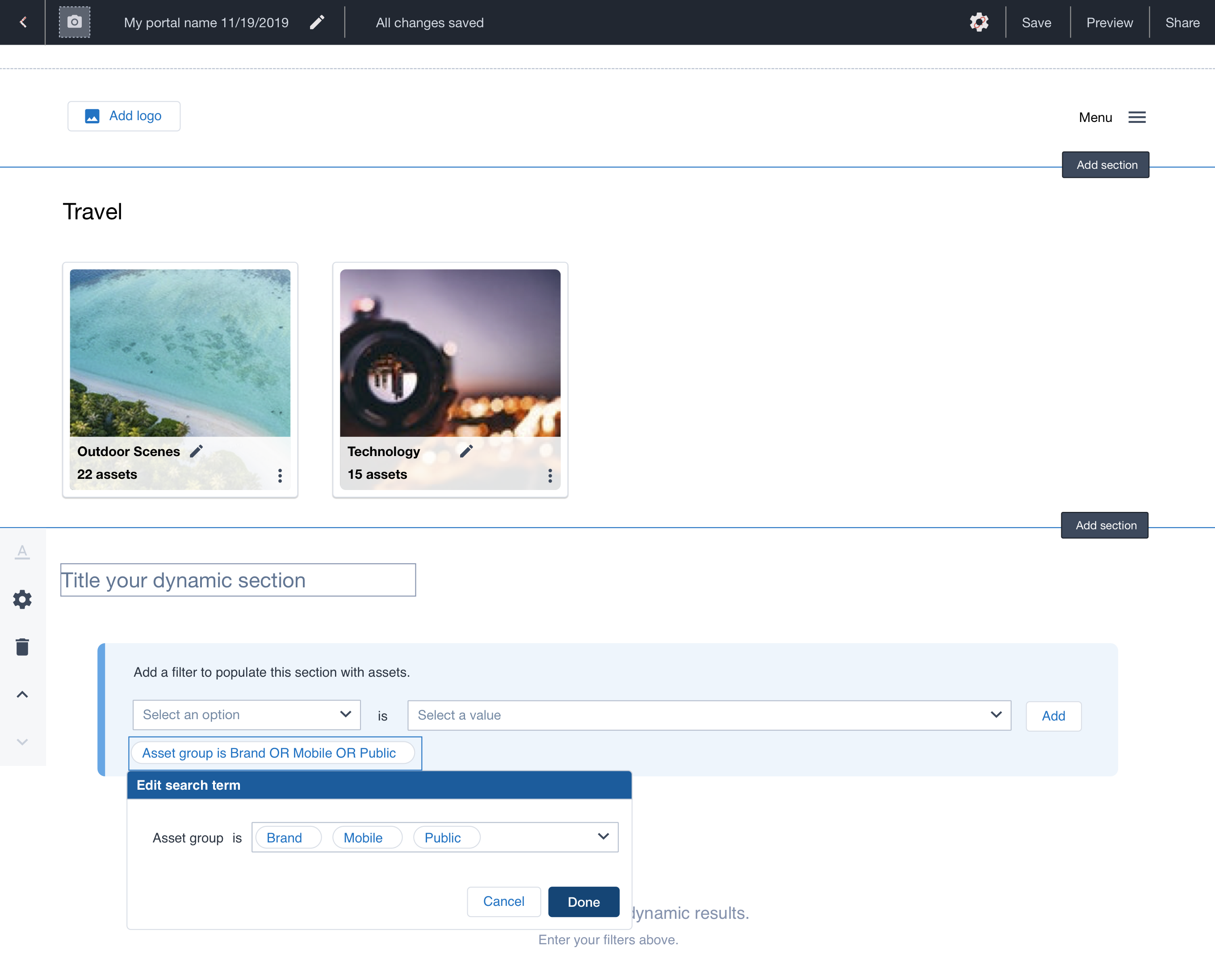 Within our WYSIWYG editor, users have always enjoyed the freedom to pick the look and the feel of their site. They love the ability to pick specific images to display and adding content that fits the needs of their particular use cases. However, through user feedback sessions, I learned that users are also interested in a tool that would dynamically add content to their microsite from their digital asset management software. This was a common feature request and these next steps are how we developed this feature and have been incrementally improving it based on additional rounds of usability testing.