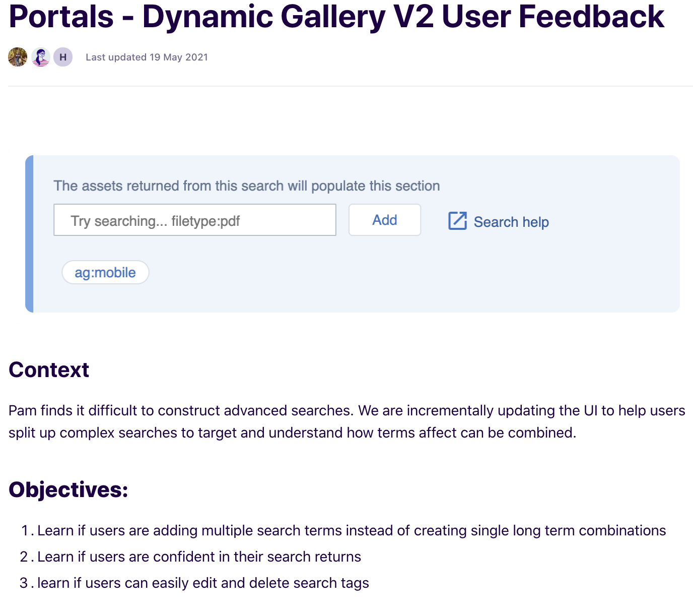 The first step in the process was to perform some exploratory interviews with current users. Paired up with a UX researcher, we interviewed 10 users who create asset galleries and have created portals with similar content that they update regularly.